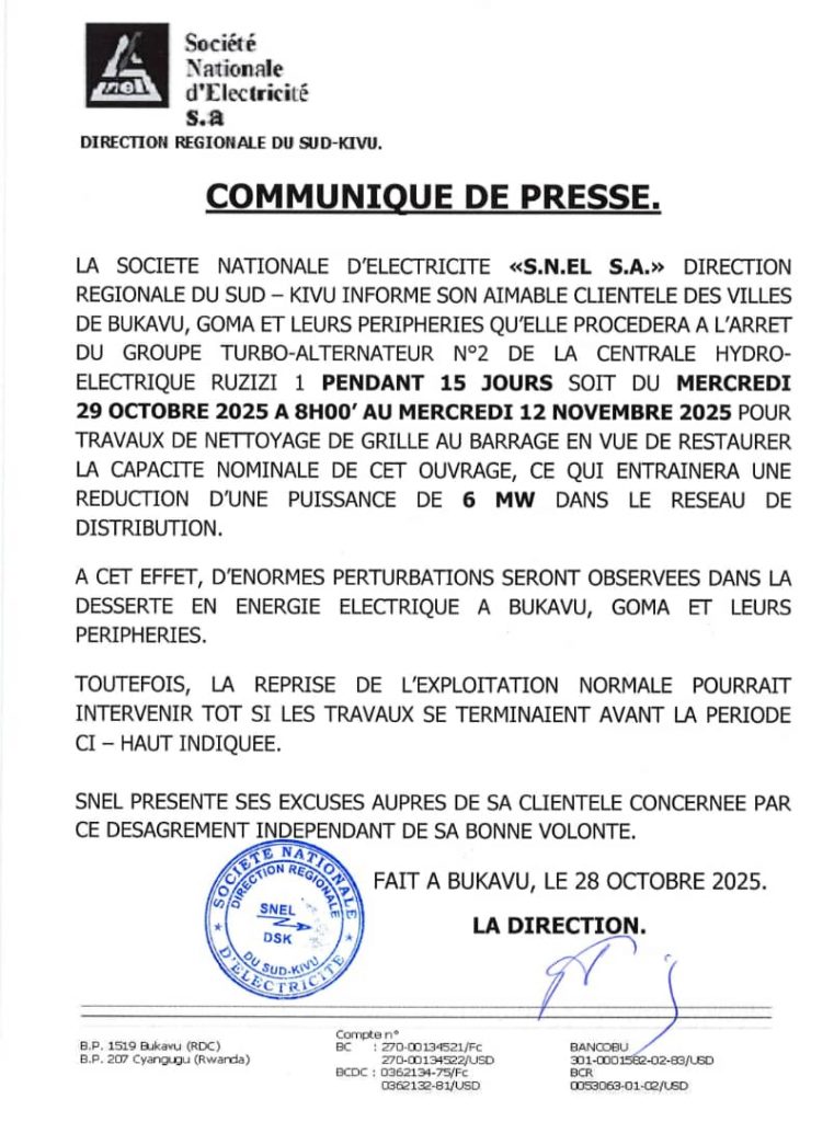 La Société Nationale d’Électricité (SNEL), Direction régionale du Sud-Kivu, informe sa clientèle qu’elle procédera à l’arrêt du groupe turbo-alternateur N°2 de la centrale hydroélectrique de Ruzizi 1 du mercredi 29 octobre au mercredi 12 novembre 2025. Cette opération vise le nettoyage des grilles au barrage afin de restaurer la capacité nominale de la machine.