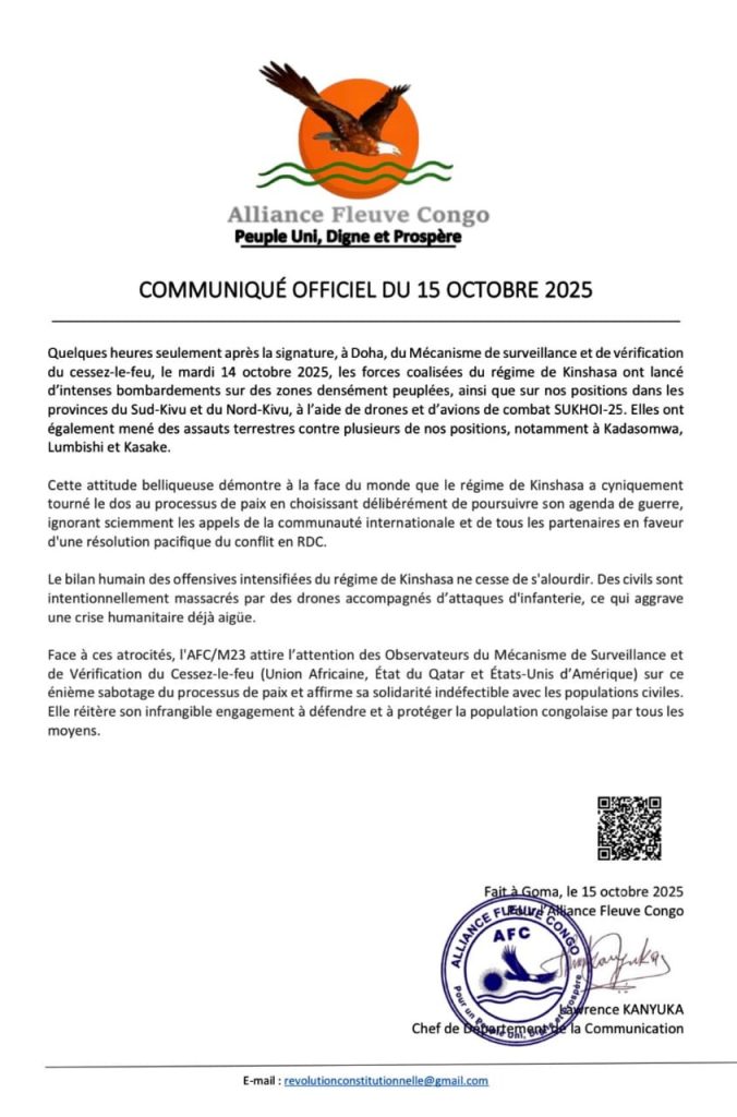 Dans un communiqué publié ce 15 octobre 2025, l’Alliance Fleuve Congo/M23 (AFC/M23) a vivement dénoncé la reprise des offensives militaires du régime de Kinshasa, à peine quelques heures après la signature du Mécanisme de surveillance et de vérification du cessez-le-feu à Doha. L’AFC/M23 estime que ces attaques traduisent un mépris flagrant du processus de paix en République démocratique du Congo.