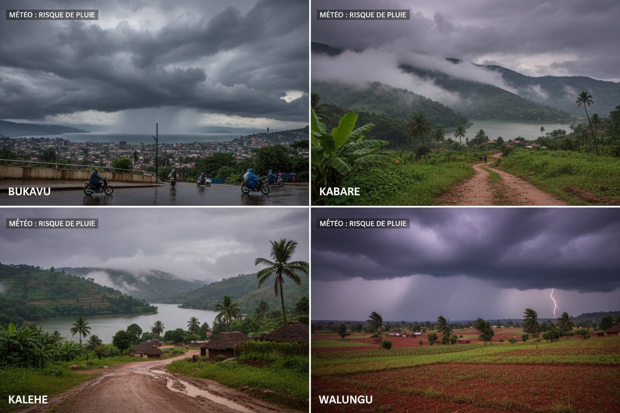 Dans la ville de Bukavu et dans les territoires voisins de Kabare, Walungu et Kalehe, la matinée devrait être marquée par un ciel couvert avec une forte humidité. Les modèles météorologiques signalent la possibilité d’averses dès la fin de matinée et un risque de pluies orageuses dans l’après‑midi. Les températures y varieront entre 14 °C et 25 °C à Bukavu, et autour de 15 °C à 27 °C dans les zones de Kabare, Walungu et Kalehe, tandis que l’indice UV pourrait atteindre un niveau élevé en cas d’éclaircies passagères.